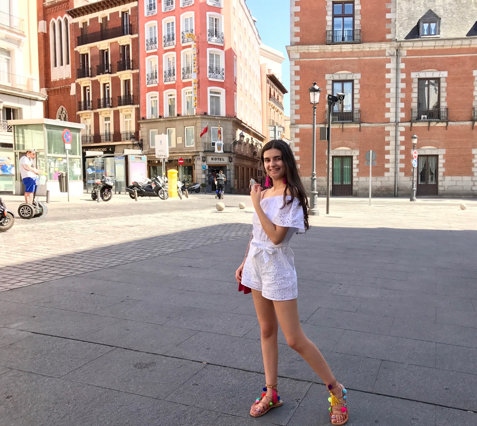How are you? In today's post I wanted to show you some of the pictures that we took in my last stay in Madrid (there will be more posts). I have to say that the weather was absolutely hot, however I really has a good time there. I've decided to wear a white jumpsuit to visit the capital of Spain. I combined it with some fucsia accessories and my pompons sandals. What do you think?